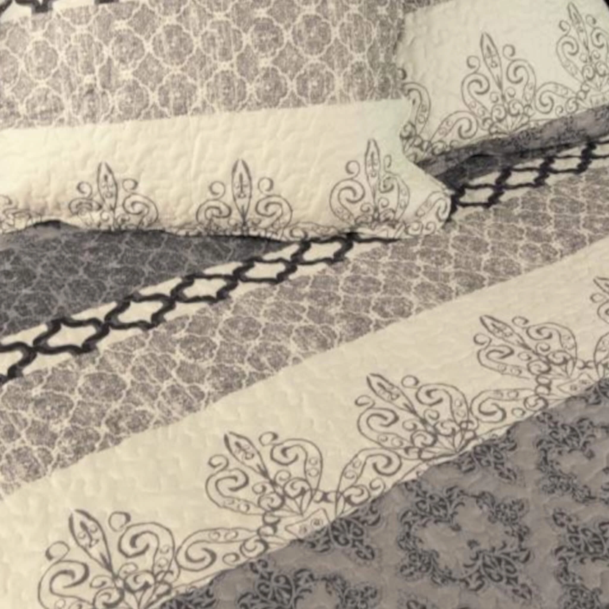 Couvre-lit Blois, de la marque Terre de Nuit. Grâce à ses différents motifs arabesques disposés sous la forme de bandes, le couvre-lit Blois sublimera votre décoration d’intérieure par son originalité et son authenticité. Ses coloris gris et blanc s’adaptent à tous les types d’univers en ajoutant une touche d’élégance et de raffinement. En plus d’être un élément de décoration, ce couvre-lit vous offre du confort et bien-être à chaque moment de détente, grâce à son boutis matelassé et sa composition 100% polyester.