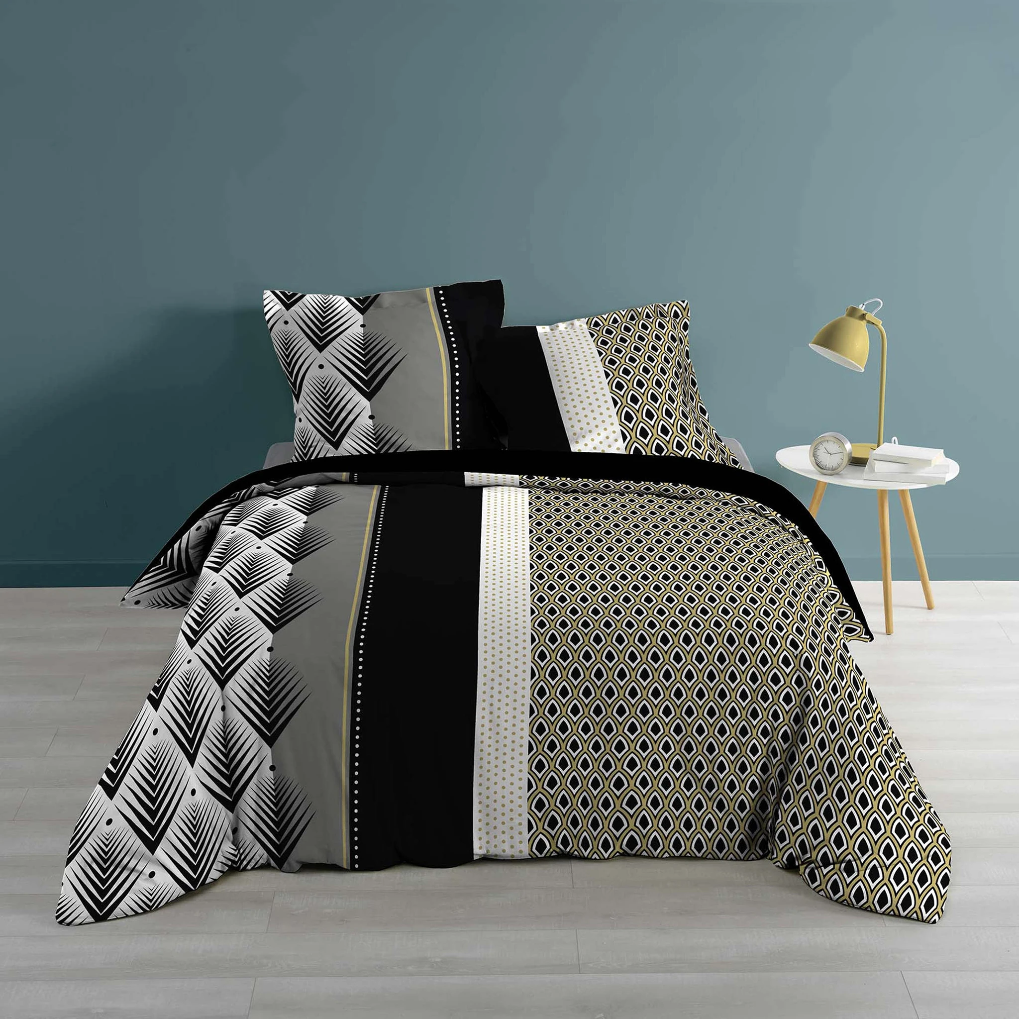 Parure de lit Galiléo, de la marque Douceur d’Intérieur. Cette housse de couette possède toutes les qualités pour faire de votre pièce un lieu très élégant et raffiné. Grâce à ses deux faces distinctes comprenant une diversité de motifs, à pois, unis, en forme de plantes, ethniques… la parure de lit Galiléo provoque un effet dynamique et vous offre un design unique pour parfaire votre décoration d’intérieure. Telle une oeuvre d’art, elle éveille vos sens pour votre plus grand plaisir et s’inscrit dans un univers tendance et moderne. Sa composition 100% coton et son tissage 57 fils/cm² met à votre portée un confort et une douceur incomparable à chaque moment de détente.