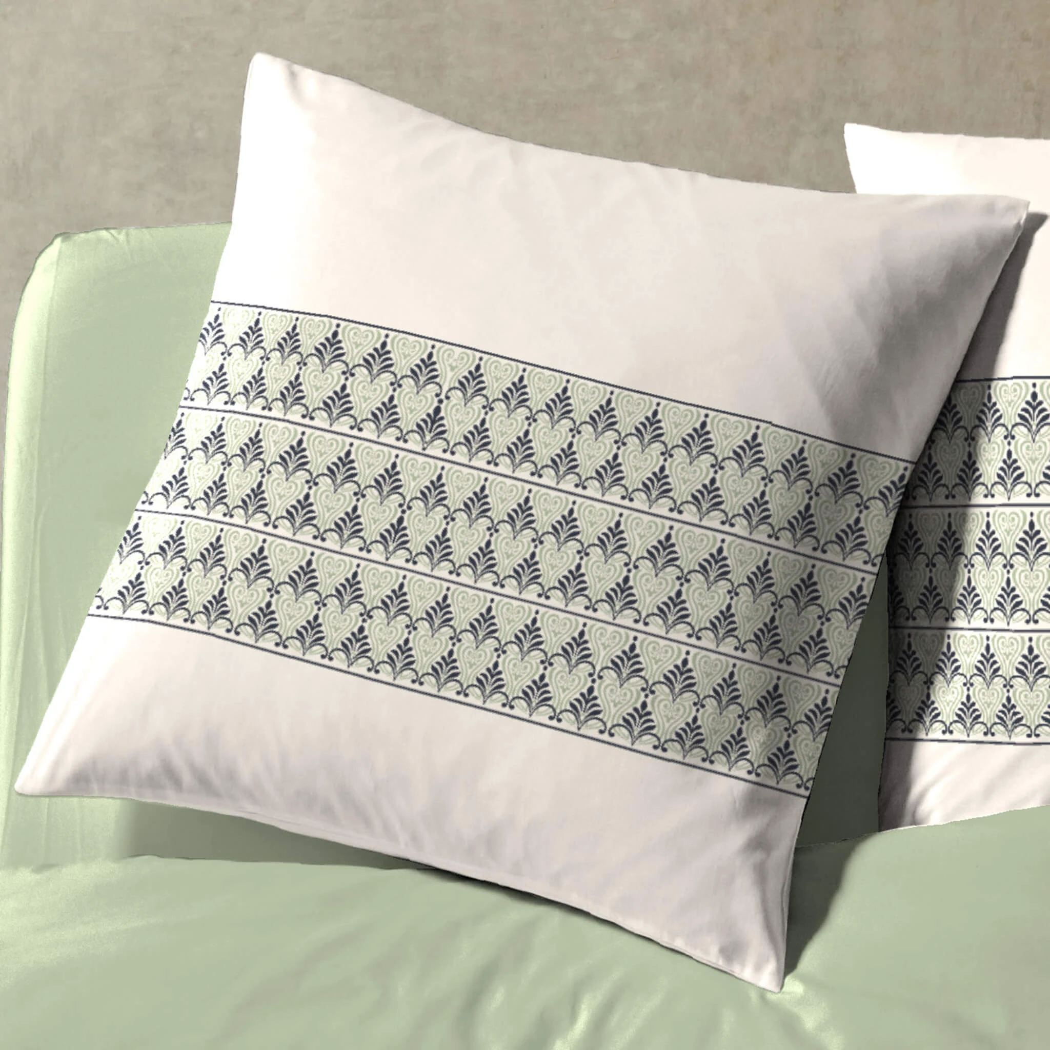 La parure de lit percale Zella est disponible en plusieurs dimensions et comprend la housse de couette en finition bouteille ainsi que deux taies d’oreillers 63×63 cm assorties au motif.